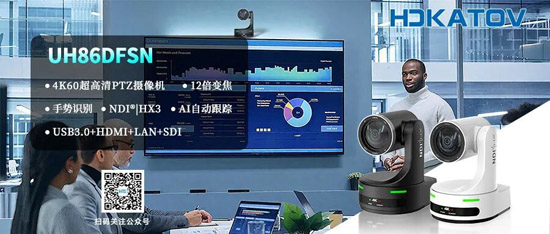 HDKATOV UH86DFSN 集12倍光学 + 16倍数字变焦、80.5°宽视角、4K60超高清画质、AI智能跟踪、自动取景、手势识别于一身,同时支持NDI®|HX3、USB3.0/HDMI/SDI/LAN 多接口输出、Free D VR/AR 视频制作。它让每一场会议、演播或直播,都能精准捕捉每个精彩瞬间。