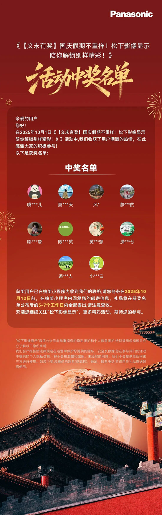 《【文末有奖】国庆假期不重样!松下影像显示陪你解锁别样精彩!》活动中奖名单