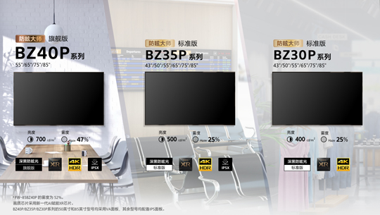 BZ40P系列(旗舰线):共四款产品,尺寸覆盖55英寸到85英寸,配备旗舰版深黑防眩光涂层,可提供47%*1雾度和低反射性能,同时具备700 cd/m²(典型)亮度和IP5X防尘等级。