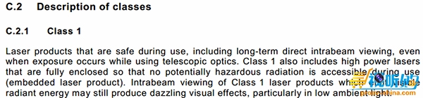 其实,国际电工委员会根据激光显示的发展要求,更新制订了激光安全等级标准IEC60825 Edition3.0(Safety of laser products –Part 1: Equipment classification and requirements),于2014年5月正式发布,又称IEC60825-2014,在此标准中,IEC根据投影显示系统投射或泄露出来的激光波长(180 nm-1 mm)和持续发射时间内(>=0.25s),检测和计算人员可接触到的辐射量,并结合应用领域把激光安全分为多个等级,包括:Class1,Class1M,Class1C,Class2,Class2M,Class3R,Class3B,Class4八个等级.激光安全等级认证是欧美市场准入的强制标准。