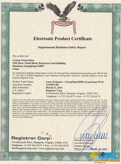 美国市场稍微特殊一点,激光产品需要得到FDA(美国食品药品监督管理局)的认证才可以在美国境内销售,FDA对激光安全的认证标准同样也是参考IEC60825,但是美国对于IEC60825的2014版仍在评估中,到目前为止(2016年1月)还未正式采用,所以,FDA的认证仍然沿用IEC60825-2007版,而按照2007版的标准,激光投影机所采用的各种激光技术都被归为Class3R及以上级别。特例:AVANZAGreenOmni HD8/WU9产品是目前世界上唯一获得FDAClass2等级认证的激光投影机产品(FDA认证检索号:1310907-001)