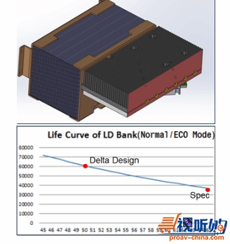 为了达到与LED光源一样的超长寿命,免维护,台达在设计第四代光源(激光)DLP显示单元时采取针对技术设计。激光光源的寿命与温度密切相关, 台达采用智能散热设计与电流调整技术,采用了业界最先进的嵌入式真空热导管散热技术,缩短热源,以及更高效率的热导管及散热鳍片设计,精确控制光源温度,保证光源长期高效稳定,保持亮度及色温恒定;早期色轮是影响激光机芯寿命的一个环节,台达在色轮设计及制造中采用特殊结构、特制材料及电流调整技术,有效提高色轮寿命,从而提高光源整体寿命,达到超长60000 小时。