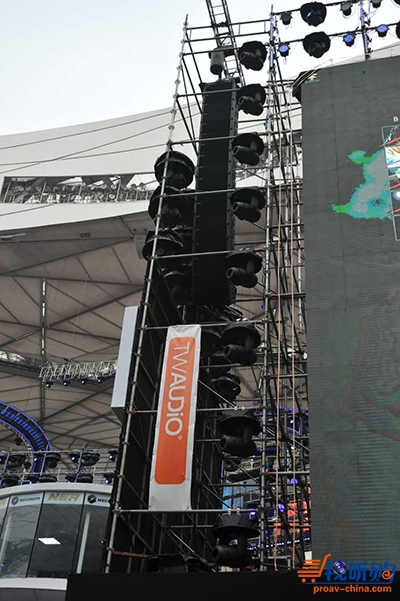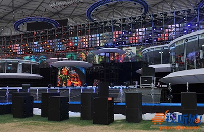 NEA演出现场能容纳观众人数约为15000,其中内场6000座,三面舞台只开放一层看台,每面3 000座。在进行声学模拟以及软件测试之后,主扩扬声器共采用36只VERA36,吊挂于舞台左右两边,各18只,主要覆盖内场及舞台对面一层看台。侧补扬声器采用12只VERA36,左右各6只,主要覆盖侧面一层看台。场地前区补声每边采用4只T24N;低频扬声器共选用16只VERA S33,超低频扬声器共选用12只 BSX,采用“超心型”搭配摆放设计,均匀位于舞台地面左右两侧。