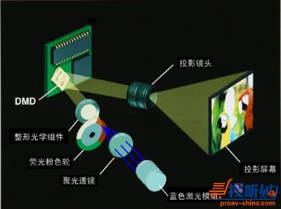 DLP是“Digital Light Processing”的缩写,即为数字光处理,也就是要先把影像信号经过数字处理,然后再把光投影出来。其原理是将通过UHP灯泡发射出的冷光源通过冷凝透镜,通过Rod(光棒)将光均匀化,经过处理后的光通过一个色轮(Color Wheel),将光分成RGB三色(或者RGBW等更多色),再将色彩由透镜投射在DMD芯片上,最后反射经过投影镜头在投影屏幕上成像。