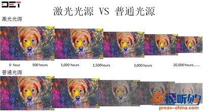 根据上述LCD灯泡投影出来的色彩变化(工作1500小时、3000小时候后分别维持原亮度的60%、40%),我们作出了激光光源与LCD灯泡光源的投影画质对比: