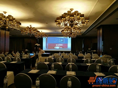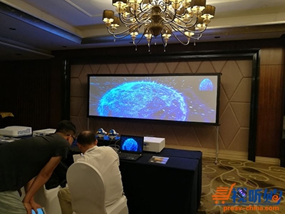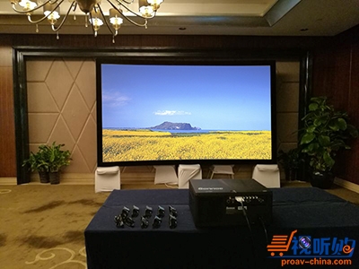 会场的主幕投影采用13000流明的Sonnoc(索诺克)高端工程投影机SNP-DSU13K,投射在200寸的OS快折幕上,投影机双灯光源驱动,轻松实现13000流明的高亮度,1920×1200的全高清画质,满足展会现场高清的画质需求,6段色轮极致色彩表现,给现场观众无与伦比的视觉冲击力。
