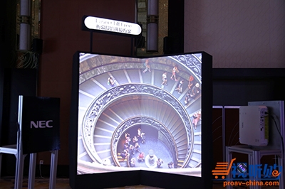 为应对商场橱窗、酒店娱乐等行业需求。NEC还在现场展示了折幕投影拼接解决方案,该方案采用NECP502HL+工程投影机,具有全高清分辨率,20000小时超长寿命,大范围镜头位移(位移达到了62%),支持左右镜头位移(位移达到28%),并且支持360度投影和竖向投影,功能极为齐备。