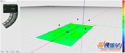 :“我们选择左右声道的立体声扩声音箱必须能独立覆盖85%以上的观众区,所以使用EAW线阵列扬声器。扬声器角度水平110°,垂直15°,通过EAW软件模拟建模,主扩由每组4只线阵全频和1只线阵低音搭配,这样每个线阵组就会得到110°x 60°的最佳覆盖角度;同理补声以每组2只线阵全频和1只线阵低音搭配,就能得到110°x 30°的最佳覆盖角度。