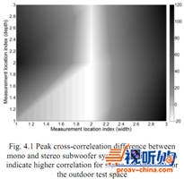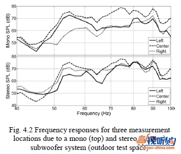 在户外测量当中,单声道次低频系统的空间变化幅度为6.5 dB,立体声系统的变化幅度为4.9 dB,变化幅度减小了24%。左声道和右声道频率响应的非对称性是由于用于测试的音乐素材(非标准测试信号)和在扬声器组后方的建筑物边缘(几乎与右侧扬声器组平齐)导致。