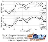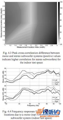 听音者在中央位置的听音点并没有从立体声次低频系统中获得任何好处,图中显示了在中央听音点拾取到了大量频率更高的成分。而在偏离中轴的测量点情况却完全不同,测量结果显示在立体声次低频系统配置时离轴区域的效果最佳。由此产生的问题是,为什么立体声次低频系统会使离轴区域的效果好于中轴区域。