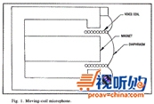 动线圈传声器(通常被称为动圈传声器)如Fig 1所示。一个与振膜连接的线圈悬挂在磁场内。当声波使振膜震动时,线圈也会在磁场内震动从而产生与输入声波相近的电信号。