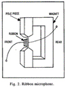 带式传声器如Fig 2所示,一块非常薄的金属箔片或带状金属片悬挂在磁场当中。声波使悬挂在磁场内的金属片产生震动,并由此产生电信号。