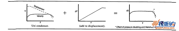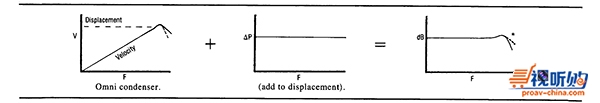 图D所示为单一指向电容换能器。这一类型的换能器对于中频共振存在阻尼。其振膜速率与频率变化之间的关系保持恒定,振膜位移则在大部分频率范围内保持每倍频程下降6 dB的趋势。输出电压与振膜位移成正比。但由于压力阶差在大部分频率范围都保持每倍频程提升6 dB的趋势,因此仍然能够获得平坦的频率响应特性。