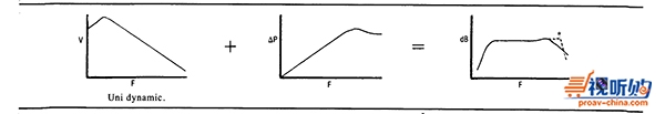 图C所示为单一指向的动圈换能器。这一类型的换能器对于低频共振存在阻尼,其振膜速率在大部分频率范围内都保持了每倍频程下降6 dB的趋势。输出电压与振膜速率成正比。但是,由于压力阶差在中高频段出现每倍频程提升6 dB的现象,因此在大部分音频信号频率范围内仍然保持了平坦的频率响应特性。