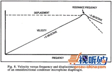 对任何尺寸的全指向电容传声器来说,振膜机构的刚度都被控制在共振频率之下(通常来说在8 – 10 kHz)。振膜的速率在到达共振频率之前都保持每倍频程提升6 dB的特性(图8)。由于振膜位移产生的是层速度,因此振膜位移幅度在低于共振频点时与频率变化为恒定关系。输出电压与振膜位移呈正比,因此在低于共振频点时输出电压也与频率变化保持恒定关系。