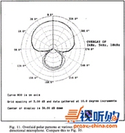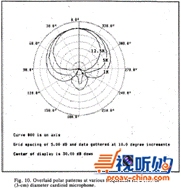 图10显示了一支振膜直径为1.19-inch(3 cm)的心型指向传声器的指向特性随频率变化而发生变化的情形。图11显示了一个微型混合心型指向传声器在同样条件下的指向特性变化情况。从图中我们可以清楚地看到,尺寸较小的传声器的指向特性在频率变化时保持了较高的一致性,尤其是在前半区。