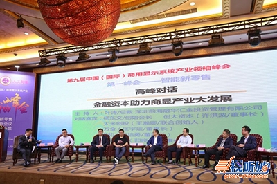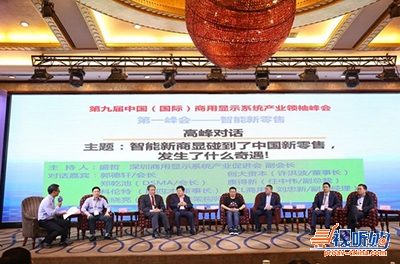 嘉宾从左至右分别为:对话主持人-中国商用显示系统产业联盟秘书长盛哲、TCL商用副总经理刘忠新、台湾数位看板多媒体联盟会长郑乾池、深圳商显产促会新当选会长/长虹电器副总经理/长虹智慧产业群董事长郭德轩、创大资本董事长许洪波、康得新副总裁任中伟、科伦特集团董事长段四才、仙视电子总经理王鹏