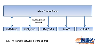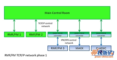 原来的演播室系统早在2004年就已经安装完毕,现有的调音台和当前的MCR都使用IPX/SPX以太网协议来控制所有调音台和MCR。由于新的DC3控制台和新的MCR由TCP/IP控制,因此要求旧的IPX/SPX网络和新的TCP/IP网络能够相互连接,新老系统必须从一个单一的控制层来控制。