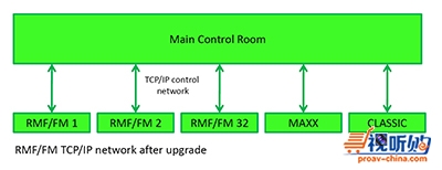 为了在旧的IPX/SPX调音台和新的TCP/IP MCR路由之间建立无缝的控制连接,Klotz Communications使用了DX20转换器单元,它将所有输入信号双向转换为TCP/IP或IPX/SPX,具体取决于设备控制接口。所有命令均无任何延迟地被转换成另一种格式,所有的功能都可以在两种协议中使用。在升级的第一阶段,三台DX20转换器用于连接RMF/FM 3,MAXX和CLASSIC直播室,还有一些用于连接位于MCR的按钮式控制器。