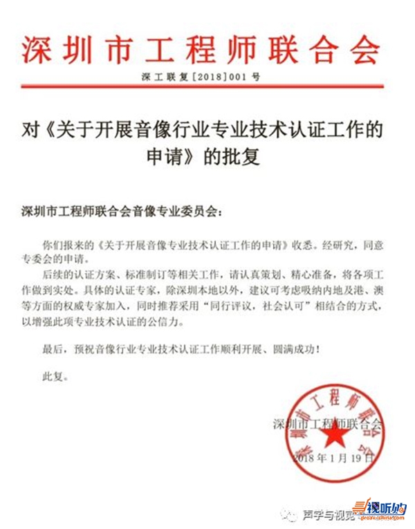 2018年新春伊始,1月19日,音像专业委员会提交的《关于开展音像行业专业技能联考认证工作的申请》得到了深圳市工程师联合会的批复。