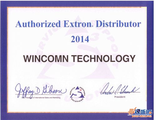 【专业视听网报道】:2014年1月,世界领先的专业视音频系统产品的领导厂商美国Extron向高端音视频综合服务商赢康公司正式颁发2014年度中国区授权代理证书,这标志着双方的合作步入第十个年头。