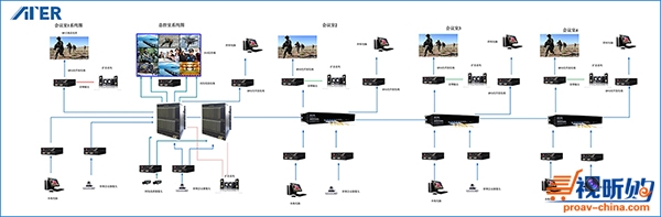 在这样的大环境下,ATER光纤矩阵成功服务于某市委全光网络会议系统,而不仅仅是服务于非光纤不可的特殊领域,让会议更安全、稳定、高效。该市委为了适应日益频繁的电视电话会议,特别是会议的高清显示要求,采用全光设计来支撑高清系统。从总控制室布放光缆到5号楼和礼堂等四个会议场所,为从标清到高清视频做好支撑。通过光纤矩阵,可在总控制室的3×3拼接大屏幕和9台监视器上看到各会议室实时传回来的清晰画面,便于进行统一的信号调度管理。