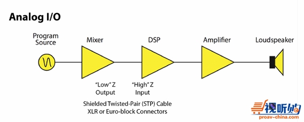 模拟信号的电压会随着时间发生变化,电平范围宽达100 dB以上。可依据电压大小对信号进行分类(例如,话筒电平,线路电平,扬声器电平)。而且信号是单向流动的——只能从输出流至输入。电缆电容决定电缆长度,在某些应用场景,电缆长度可达300m。
