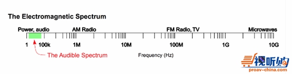 图2:模拟音频(有时又称为基带音频)的频谱含量低于100 kHz。相对于整个电磁波谱而言,这是“低”频。