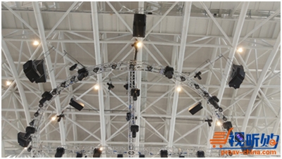 中间圆形舞台的主扩声扬声器由EAW QX364和QX366组成,共分成8组。QX364角度60°H×45°V覆盖二层观众区,QX366角度60°H×60°V覆盖一层观众区。8组扬声器组围绕中心舞台均匀吊挂安装,吊挂高度约13米。