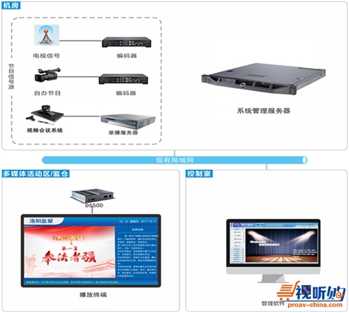 睿景再教育系统,可通过局域网对整个系统集中控制、统一管理。播放终端可对监狱全面覆盖,覆盖范围主要包含:监狱大门、会见大厅、监狱医院、指挥中心、监区值班室、走廊等公共区域;系统支持多种媒体展现形式,包含电视直播、会议直播、点播培训、信息发布等。