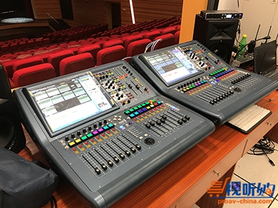 为了不破坏剧场的装修风格,剧场预留了扬声器系统的安装位置,所有扬声器都隐藏在透声布后面。为了涵盖多种演出类型的需要。舞台音响系统的主扩声形式采用左中右声道线阵列配置。左右声道各吊挂8只TWAUDiO V36线阵列音箱,中央声道采用6只V36线阵列音箱。舞台两侧各放置1只BSX 双21寸超低频音箱,用作补充现场低频能量。2只T20点声源音箱用作下补声音箱。台唇前面均匀分布10只M8作为台唇和乐池音箱,为舞台前区观众席和乐池提供补声。舞台返送配备了6只M15用作固定返送音箱,4只M12作流动返送音箱使用。整个扩声系统由21台K3DSP 数字功率放大器驱动。