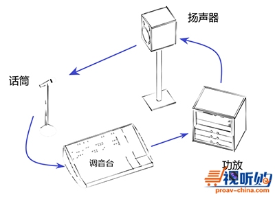 如果音响系统通过开放话筒再次拾取到从扬声器发出的放大信号,且在某些频率,到达话筒的反馈信号超过了原声源产生的信号电平,就会出现啸叫。这时候,音响系统成了自己最主要的输入源。放大的声音会被反复放大。图1为啸叫产生的示意图。