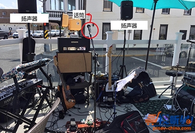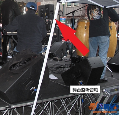 还有个实用的技巧送给歌手:留心你的表演位置。话筒对着嘴巴的同时,也有可能间接地朝向音箱了。在小型乐队设置里,标准的设置是,扬声器安装在支架上或者放在稍高于人头的位置。但是,很多情况下,因为场地受限,扬声器都放在了表演者身后。图2就是个经典范例。