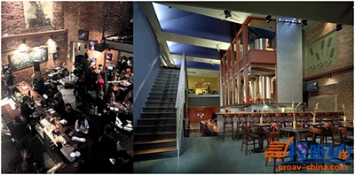 还有一种室内环境非常不适宜演出:天花板高,我的意思是,高于4m(13英尺)。图4从两个不同角度展现了位于新泽西州普林斯顿的Triumph Brewing公司的酒吧区域。这个房间优雅美观,但设计并不适用于音乐用途。不只是因为这个房间会产生较长的衰减时间(混响时间长),军鼓演奏时,它还会产生耳朵可分辨的清晰回声。这种声学环境对某些音乐风格是致命的。可惜,鼓手并不能对此做些什么改变。即使小声些击鼓也几乎无济于事,解决不了回声或混响问题。在更大型的房间里,有时候他们会请音响工程师支援,他可能会在鼓上支话筒。这是好事,因为标准的扬声器是带指向的(声音集中指向某个方位,通常朝前指向),而鼓是全指向性的(声音朝四面八方发散)。小声些击鼓,可能有助于减弱房间的破坏效果,让扬声器把声音投射到听音区。