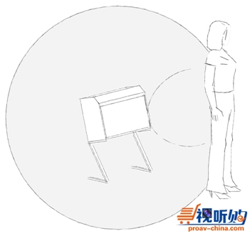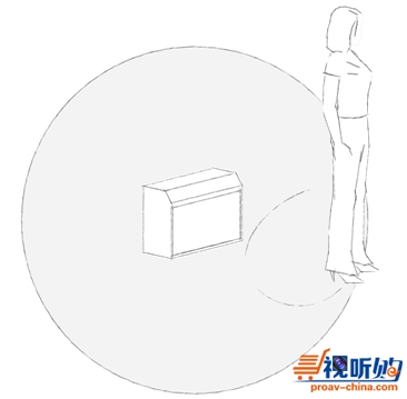 把声音想象成一个球体。从空间的一点开始分散、变大。这个球形表示的是扬声器典型的低频声覆盖,椭圆表示中/高频通常集中的区域。椭圆的正中间常称为扬声器轴上点。在椭圆线区域之外,中/高频下降6dB,或者只有感知响度的一半左右。你的耳朵离椭圆越远,你能从扬声器直达声中听到的中/高频越少。
