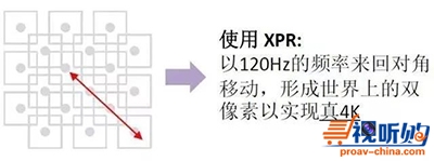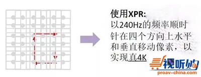 而0.47吋的芯片原生分辨率只有1080p,它采用了更快频率的XPR技术,让微镜能够以240Hz的频率顺时针在四个方向上进行水平和垂直位移,换句话说就是使用两次XPR技术从而实现4K显示。这种方式可以有效降低整机成本,让4K产品可以更好的在家庭领域普及。也正是得益于它,4K家用投影机才能迅速降到万元的价格区间。