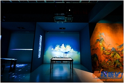 展场还设置了与《千里江山图》相关的“人间词话”、“大象无形”、“弦外幽深”、“兰亭山水”互动体验区,让观众感受画卷美的真谛。每个互动体验区分别采用两台PX753UL以正投及垂直纵向投影的组合方式轻松实现互动画面,PX753UL的360度全方位自由安装可在吊装支架上以任何角度摆放,为展览展示提供了更多的投影解决方案。