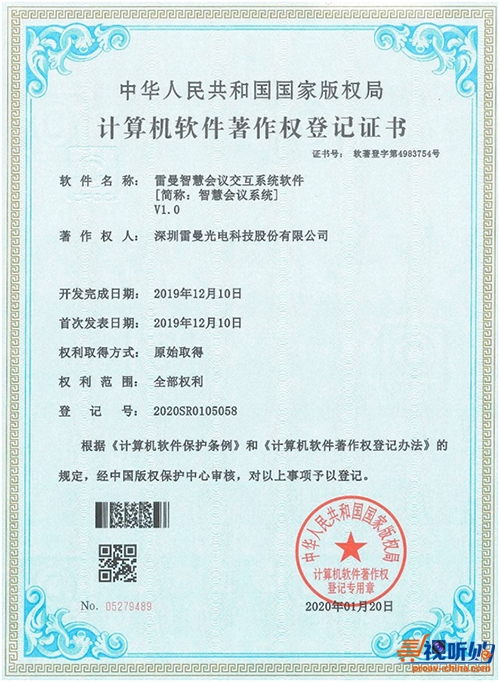 近日,深圳雷曼光电科技股份有限公司自主研发的“雷曼智慧会议交互系统软件V1.0”产品顺利通过国家版权局中国版权保护中心的严格审查,正式获得了由国家版权局核发的《计算机软件著作权登记证书》(以下简称软著)。
