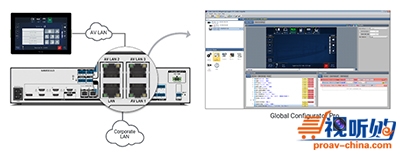 内置的Extron IP Link® Pro控制处理器,带一个安全、专用的三端口视音频局域网交换机和一个标准以太网接口。网络交换机的AV LAN端口设计用于控制本地视音频设备,能避免外部干扰或入侵。