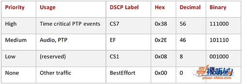 § Dante可以在网络中使用基于类别的服务的QoS(DiffServ QoS)。Dante将标记数据包,其标记可以集成到现有的IT网络QoS方案中: