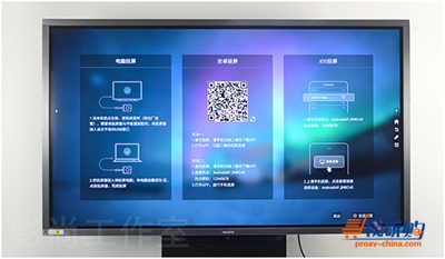 画面显示PC、iOS、安卓设备的无线投屏方式,提示用户操作