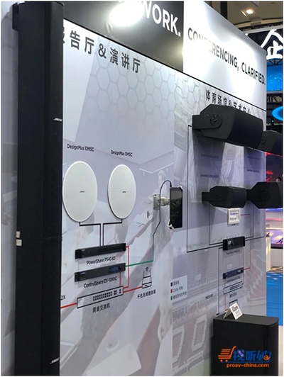 四面位于展台正中心的系统图墙由Bose专业扬声器与实景图片的虚实组合所构成,为观众展现包括体育场馆、报告餐厅、酒吧、教育场所,零售店等解决方案。