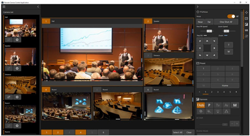 佳能提供免费的电脑用软件——摄控一体机控制应用程序,允许在一台计算机上同时操控多达9台摄控一体机,实现“多台摄控一体机同时操作”。此应用程序的用户界面简洁易用,能够根据拍摄现场灵活响应,无需摄控一体机控制器即可实现一人通过计算机进行远程操控。