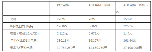 相比台式机,一体机更省电。普通台式机,显示器+机箱功耗为220W,而一体机仅70W,节省了150W。以每台电脑一天开机8小时、商用电价1.2元/度计算,链家如果为所有门店配置一体机, 7.5万台每年可为节省电费27,108,000元!