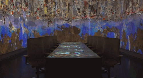 位于这个高耸白色空间的正中央,是一种类似“会议室”的摆设——一个巨大的白色长桌和10张白色工作椅。头顶上,有7部投影机和一系列镁光灯,空气中散发着某些未知香料的味道,这一切,都活似一个拍摄未来风格电影的制片厂。