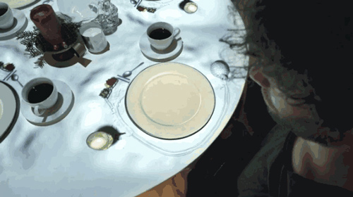 投影投射在空间的每一面墙壁和餐桌上,投影的物体大小和形状会受到餐盘的影响。当将碗碟放在桌子上时,碗碟所包含的风景画面就会散发到桌面和四周。