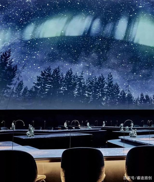 穿过二楼堆满酒的玻璃酒窖,就进入到最让人惊叹的餐厅部分。整个餐厅的灯光设计让氛围显得非常迷幻。一进入餐厅,就会被眼前的景色所惊叹,充满萤火虫的森林美景,北极夜空中出现的极光,游动着水母的深蓝色海洋……