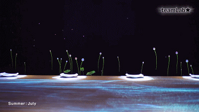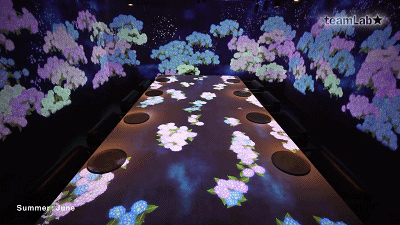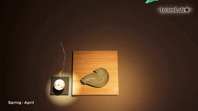 Teamlab创造了一个不断变化的环境,反映日本不断变化的季节。因此,投影也受用餐者的行为影响。如果你保持不动,一只小鸟可能会落在你手上。你突然移动,它会被吓得飞走。