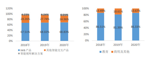 按产品划分,2020年IWB产品、其他智能交互产品、智能视听解决方案占营收构成比例分别为68.83%、24.96%、6.21%,分别实现营业收入27.49亿元、9.97亿元、2.48亿元。