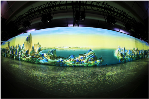 “丹青剧场”是展馆内最大的弧面环幕单元,机位和成像距离相比“盛世长卷”的场景更为复杂。对于同一型号的投影机而言,环幕场景需要较高的适配性。